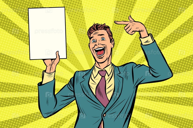 Поп-арт Бизнесмен указывает на плакат с копировальным пространством