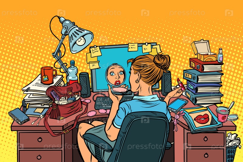 Поп-арт Деловая женщина на рабочем месте красит свои губы