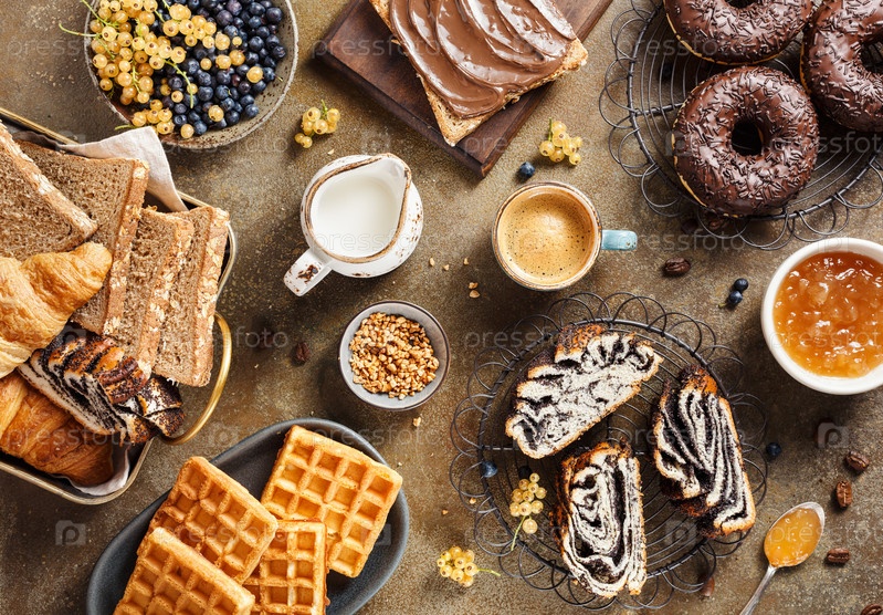 Вкусный завтрак с большим количеством сладкой выпечки, бельгийские вафли, пончики, кроассанты, тосты с шоколадом и кофе