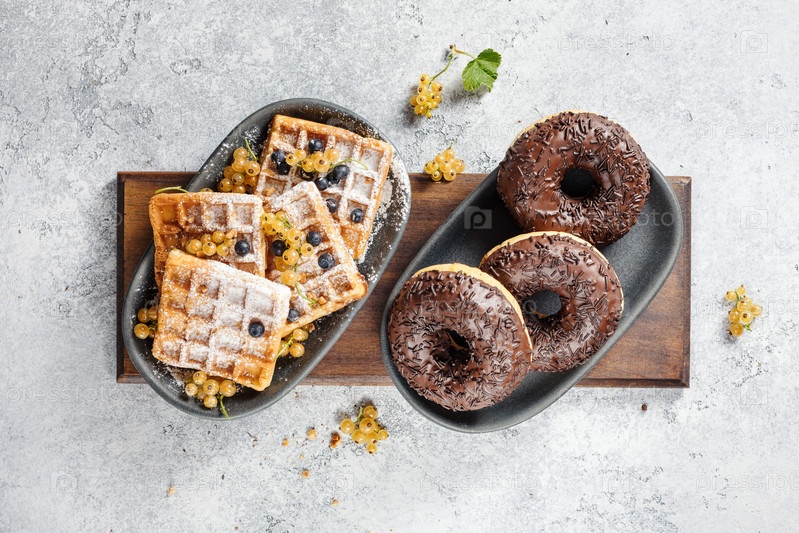 Шоколадные пончики и бельгийские вафли, вид сверху