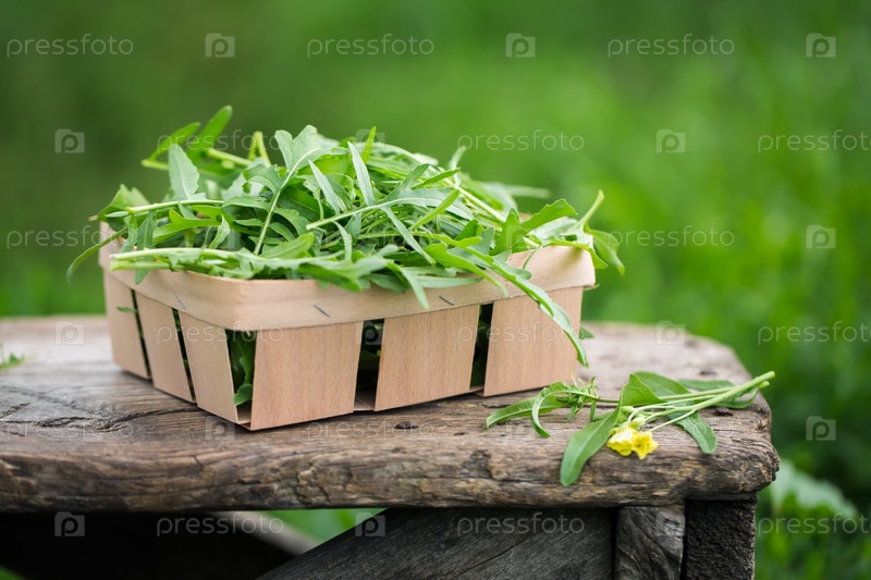 Свежие листья ругулы на садовом столе