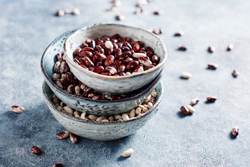 Различные виды бобов в мисках на синем фоне
