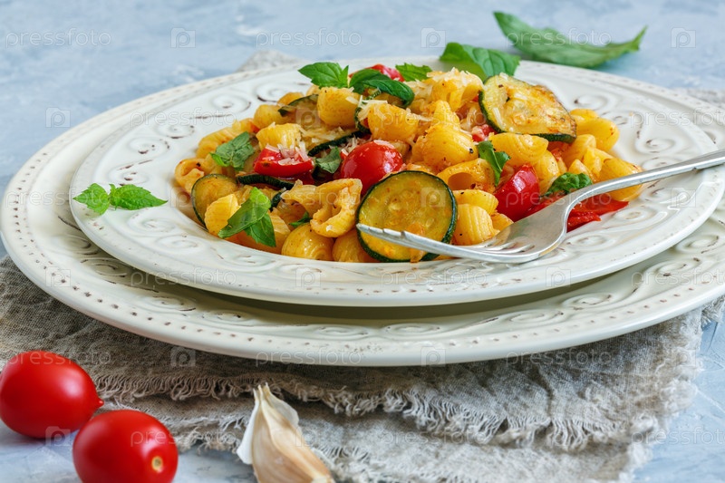 Макароны с кабачками и вишневыми помидорами