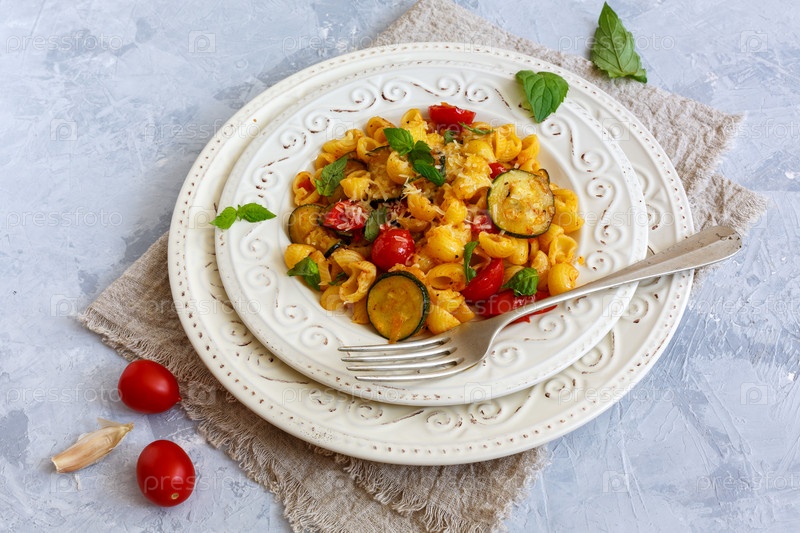 Макароны с кабачками и вишневыми помидорами