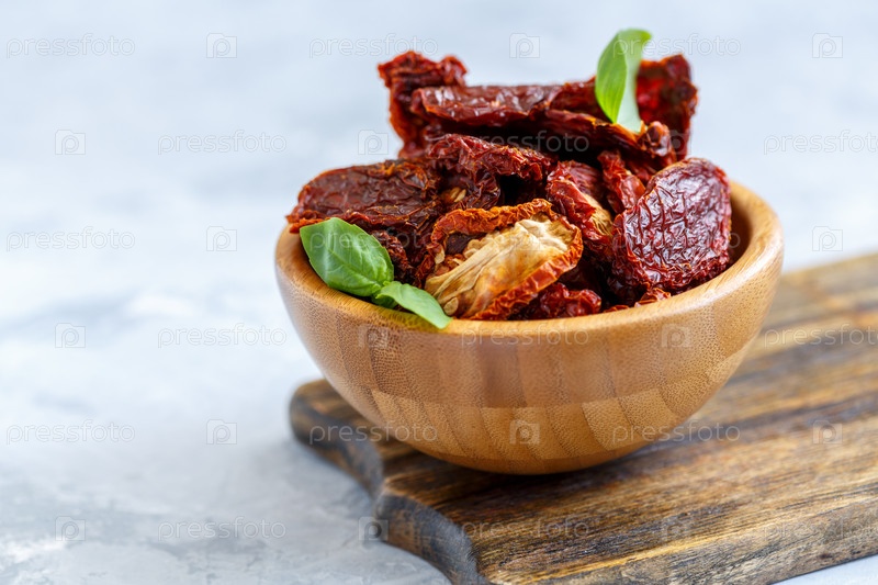 Домашние сушеные на солнце помидоры и базилик в миске
