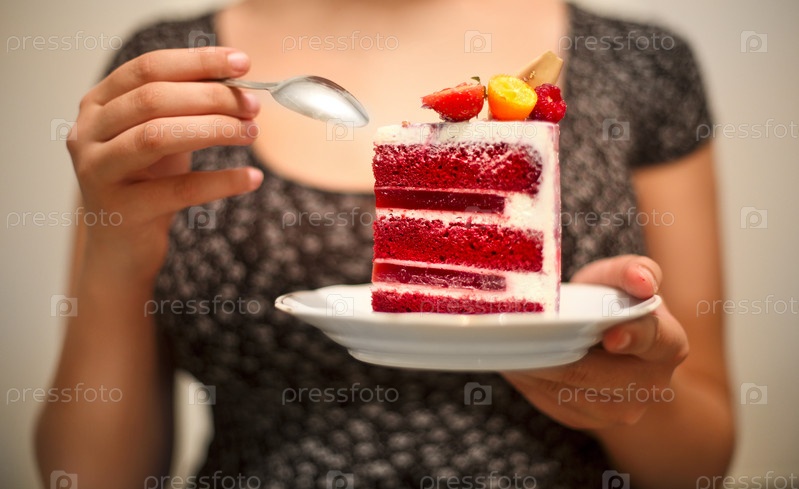 Женщина держит тарелку с нарезанным красным бархатным тортом