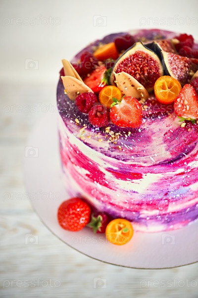 Красивый яркий торт на фарфоровом тортном стенде, украшенном фруктами