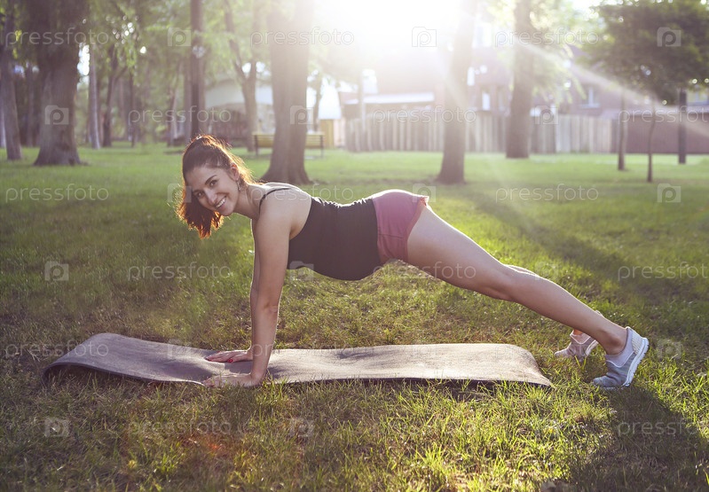 Красивая беременная женщина занимается спортом в летнем парке