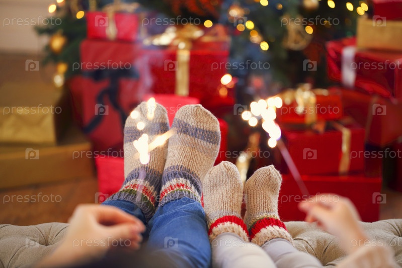 Счастливая семья с бенгальскими огнями на рождественском фоне