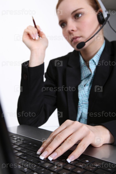 Офисная сотрудница с маникюром работает за компьютером в гарнитуре