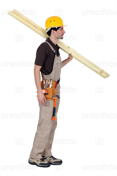 Рабочий несет две деревянные доски на плече