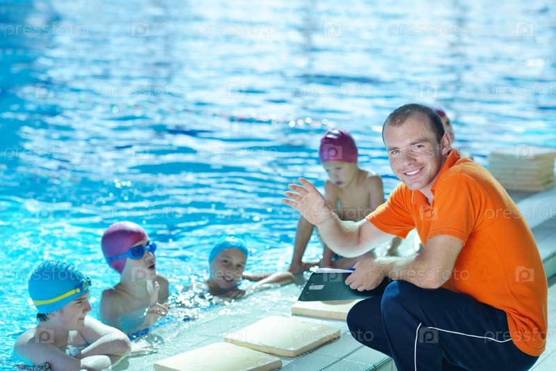 Группа счастливых детей в плавательном бассейне