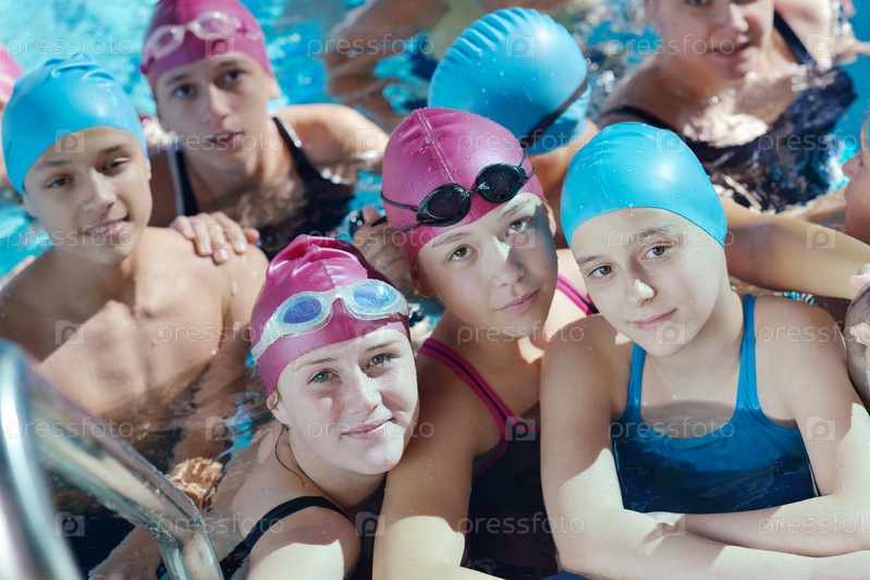 Группа счастливых детей в плавательном бассейне