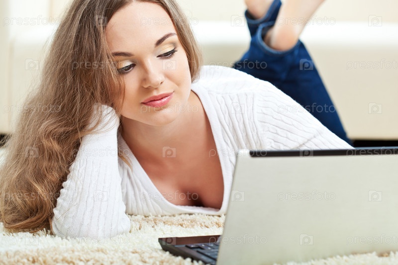 Женщина работает с ноутбуком на ковре