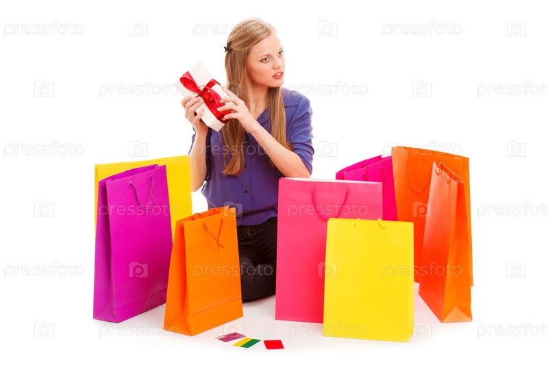 Женщина сидит на полу с пакетами