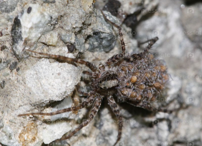Самка паука-волка несет вышедших из кокона молодых паучат
