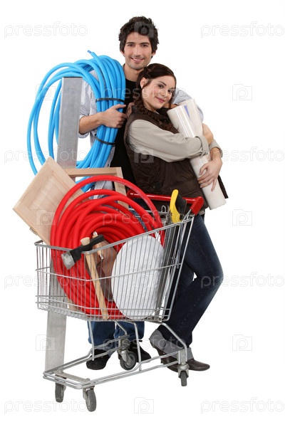 Пара с тележкой, полной стройматериалов