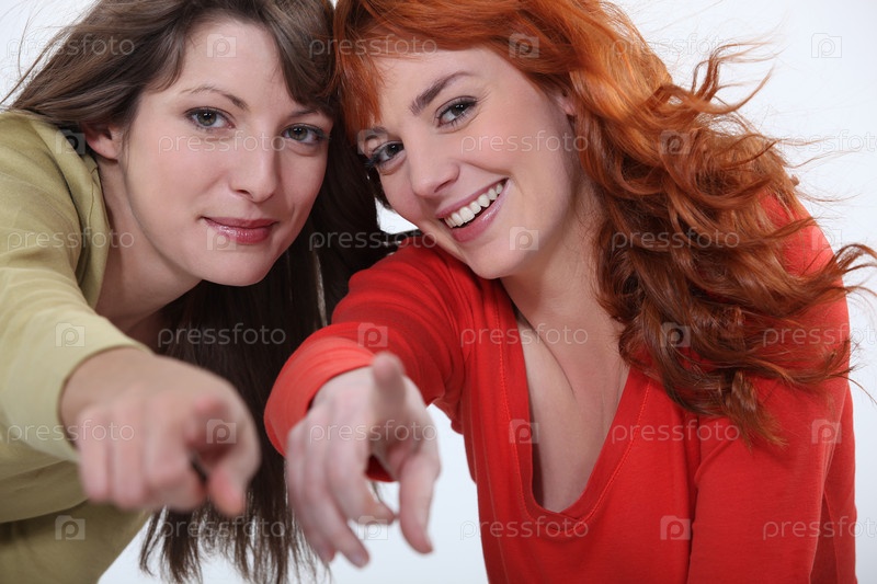 Два привлекательные женщины указывают пальцами
