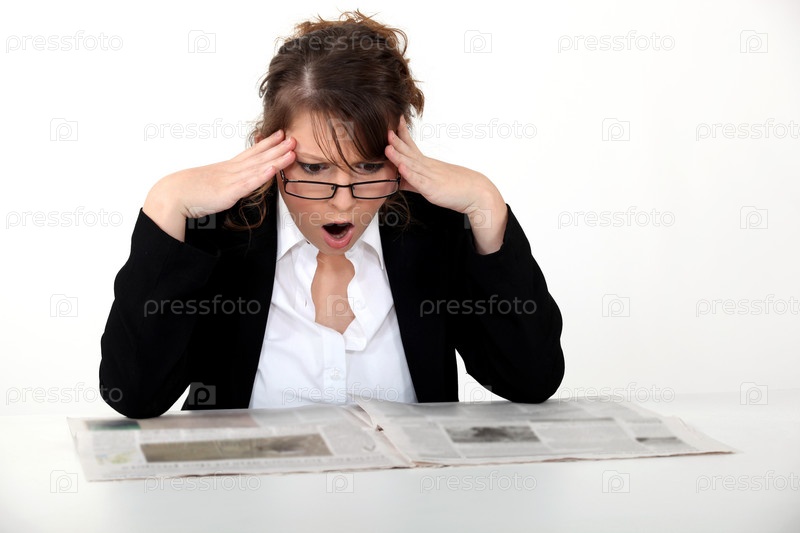 Шокированная женщина, читающая газету