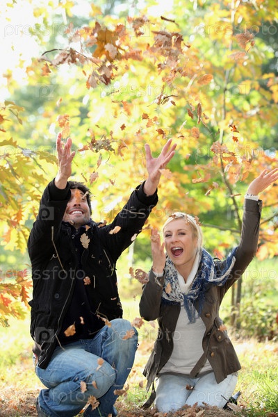 Пара играет с осенними листьями