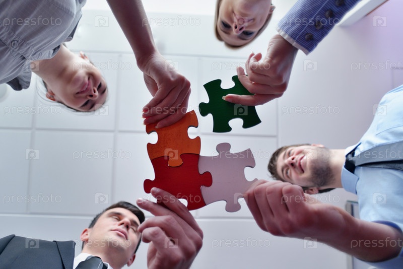 Группа деловых людей с пазлами