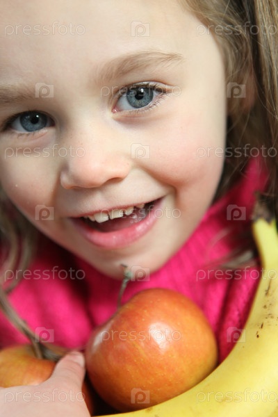 Маленькая девочка держит яблоки и банан