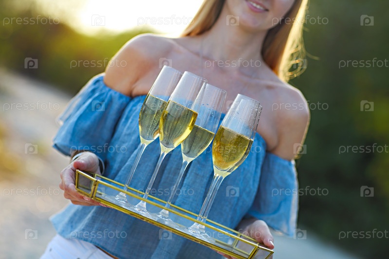 Счастливая женщина держит поднос с шампанским и игристым вином в бокалах на пляже