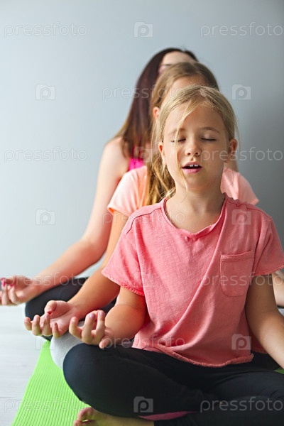 Молодая женщина развлекается с детьми, занимающимися йогой