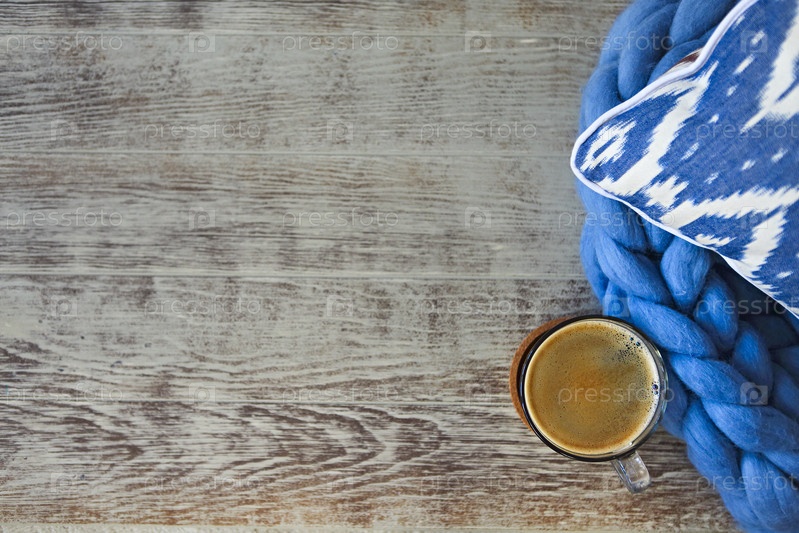 Синяя подушка с одеялом и чашечкой кофе на деревянном фоне