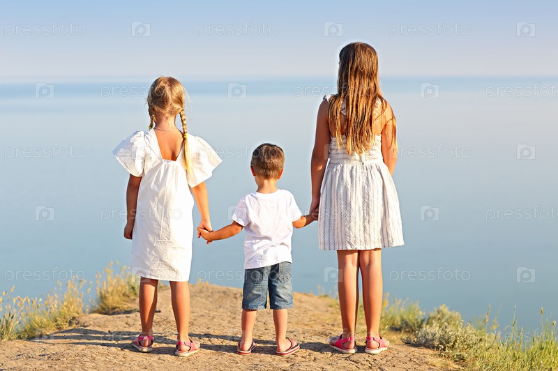 Дети держатся за руки у моря