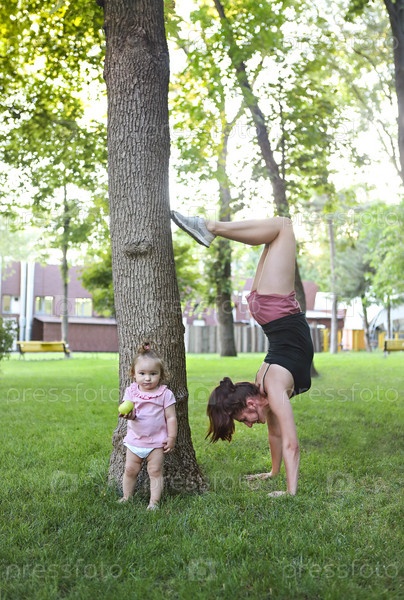 Молодая женщина занимается спортом со своим ребенком в парке