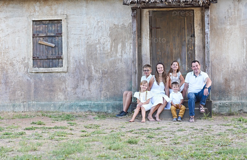 Семья с пятью детьми на открытом воздухе возле дома