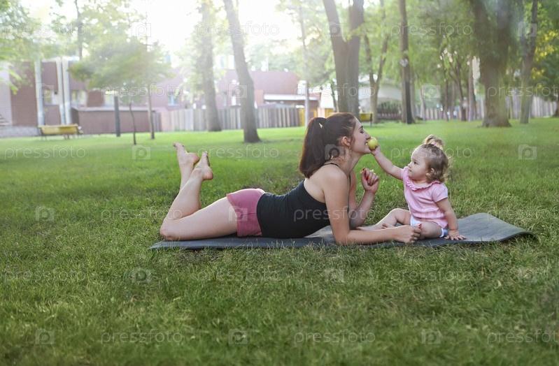Женщина занимается спортом со своей девочкой в парке