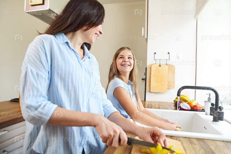 Счастливая мать и дочь готовят фруктовый салат на домашней кухне