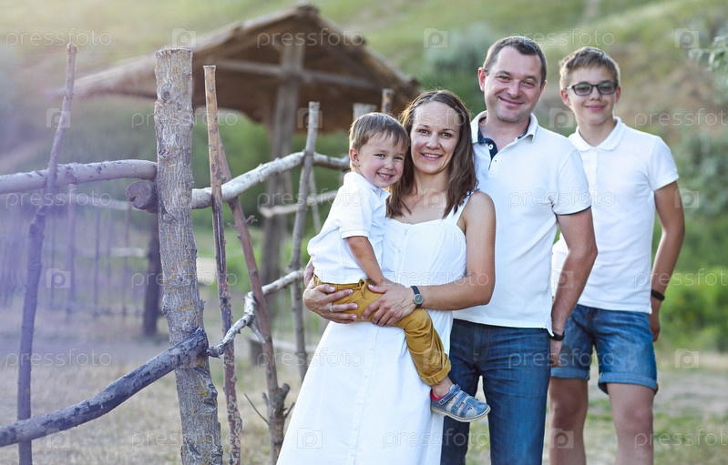 Счастливая семья с двумя сыновьями, развлекающимися на свежем воздухе