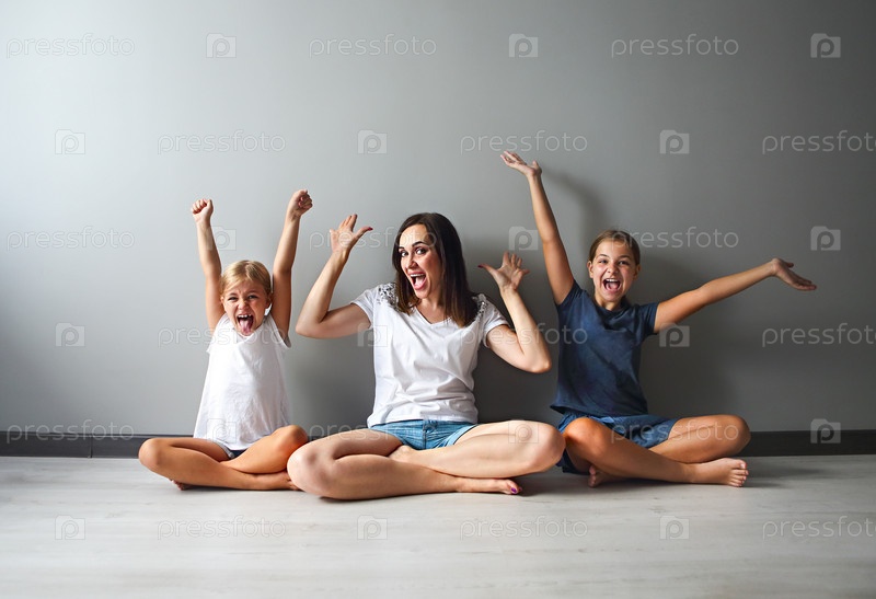 Счастливая мать и взволнованные дочери, сидящие на деревянном полу гостиной, подняли руки