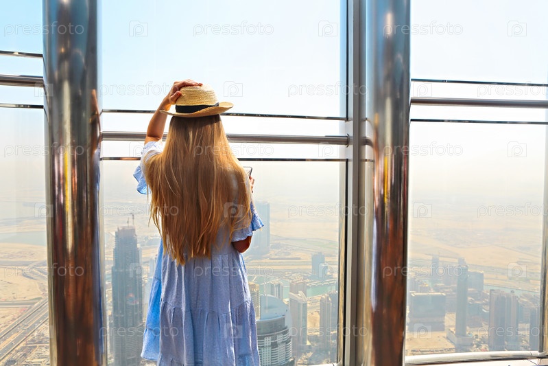 Девушка-туристка с мобильным телефоном у окна небоскреба Бурдж Халифа в Дубае