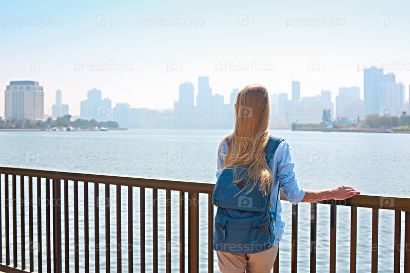 Женщина-туристка с рюкзаком и панорамой Шарджа и искусственного озера, Шарджа,