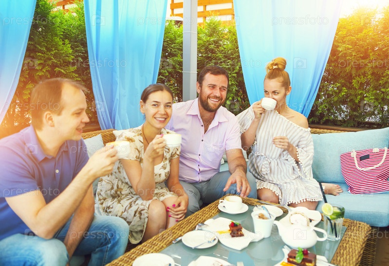 Веселые друзья сидят за обслуживаемым столом в кафе