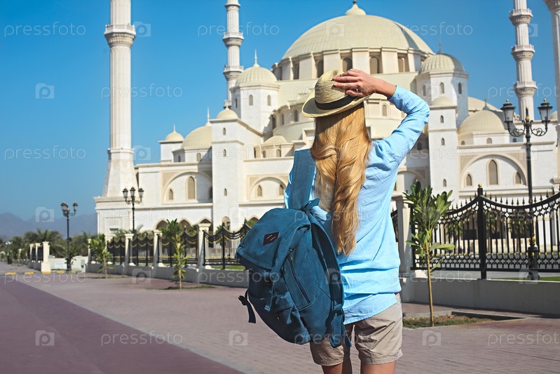 Женщина-путешественница возле Великой мечети шейха Заида в Фуджайре, Объединённые Арабские Эмираты