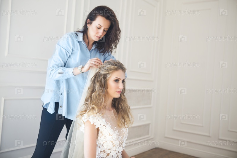 Красивая блондинка невеста и стилист