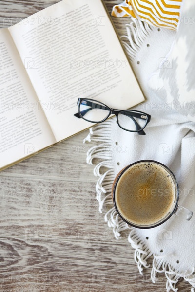 Чашка кофе, сидящая рядом с книгой и бокалы на деревянном столе
