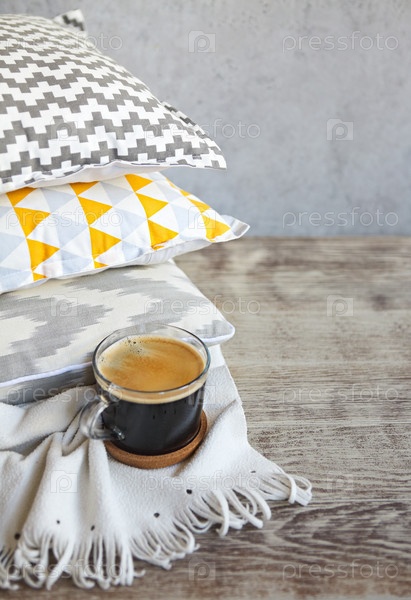 Желто-серые подушки и чашка кофе на фоне стены