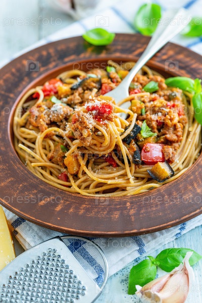 Спагетти с соусом-болонским, овощами и базиликом