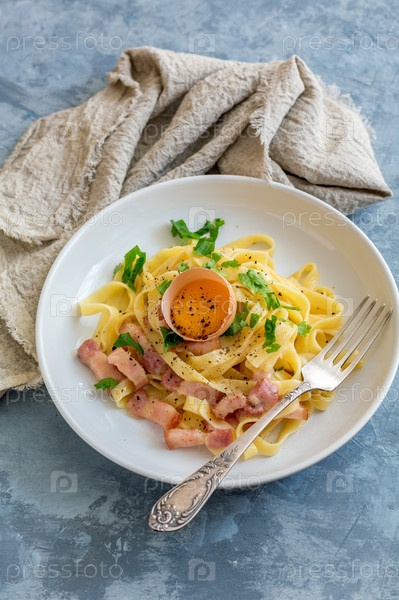 Паста Карбонара с яичным желток в белой тарелке