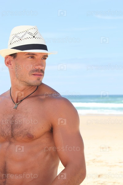 Мужчина в соломенной шляпе позирует на солнечном пляже