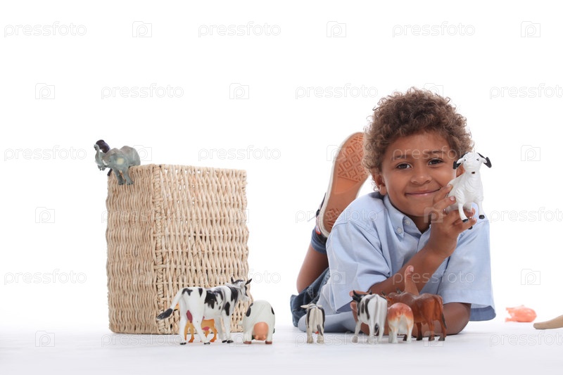 Маленький мальчик играет с пластиковыми фигурками животных