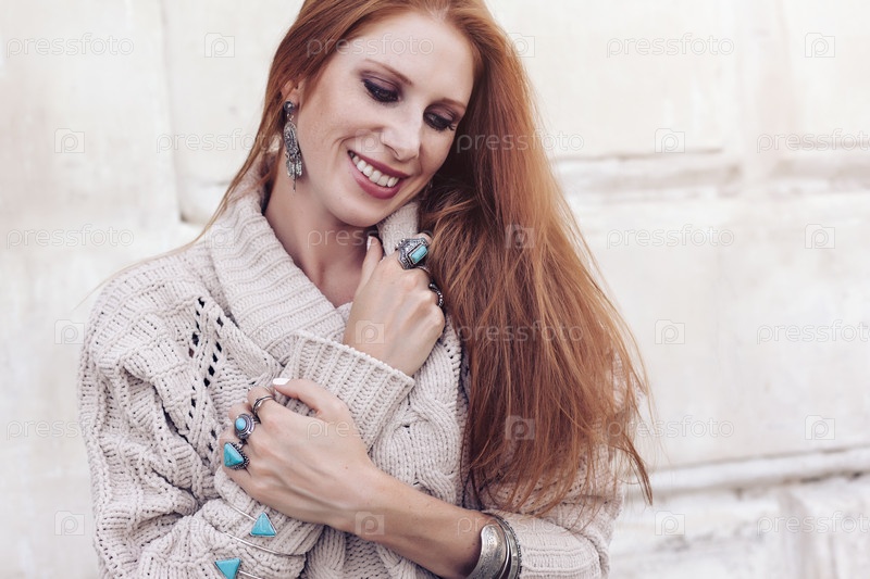 Модель в осеннем уютном свитере и ювелирных украшениях бохо