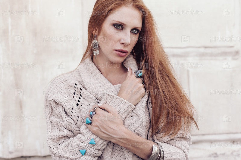 Модель в осеннем уютном свитере и ювелирных украшениях бохо