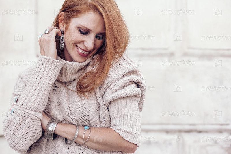 Модель в осеннем уютном свитере и ювелирных украшениях бохо